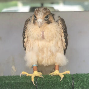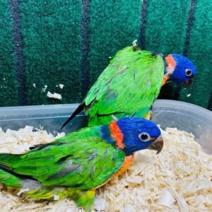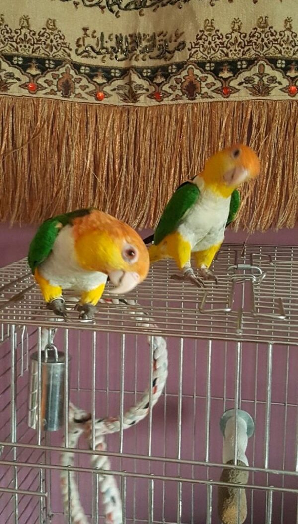 The green-thighed parrot has an orange-yellow head and vent, a white or off-white belly, green wings, thighs and back, bluish primary feathers, a pinkish-horn beak, and pinkish legs and feet. Juveniles have brownish or black feathers on the head and nape, yellow feathers on the white belly, and greyish legs. Generally, the off-colored feathers will be lost and replaced by orange or white feathers respectively as the bird matures. Young birds also have dark brown irises, which will change to a rust or orange with age. The white breast feathers of wild caiques are often stained a chestnut brown (or “isobel”) color. This may be due to tannin staining, as result of their particular affinity for bathing by rubbing their bodies against wet leaves and other plant matter.[5]
