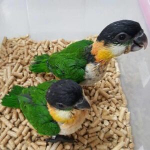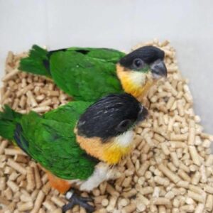 The black-headed parrot is a medium-small, short-tailed parrot with a black crown, yellow to orange head, whitish belly, yellow thighs and crissum (the area around the cloaca), green back, wings and upper tail, blue primaries (blackish from below), and greyish-black bill and feet. The white breast feathers of wild caiques are often stained a chestnut brown (or ‘isobel’) colour. This may be tannin staining, as result of their particular affinity for bathing by rubbing their bodies against wet leaves and other plant matter.[3]
