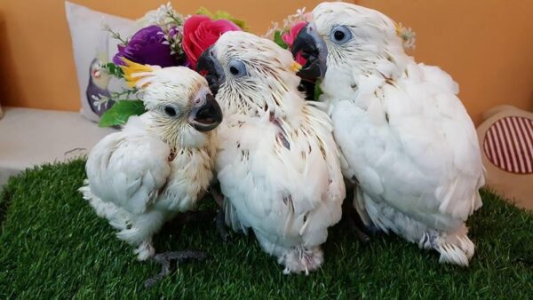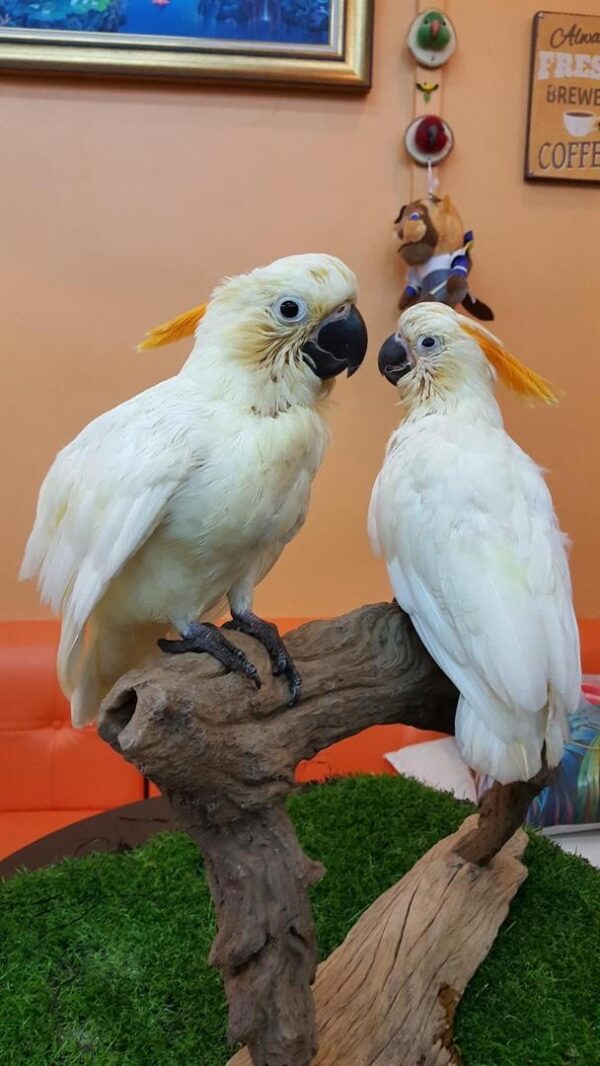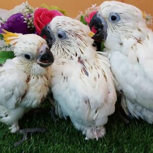 Citron Crested Cockatoo are entirely pink at first glance. However, if you startle or excite one, you will see the feathers of its crest pop up, forming a type of “headdress.” Under this “headdress,” the feathers are bright orange and salmon colored. The underside of their wings and tail is yellow, and when all of their feathers go up at once (which is common for this species) you will get quite a fantastic display of color! They have a bare patch of skin around their eyes which is blue in color. This patch of skin can sometimes help determine a Citron Crested Cockatoo’s age since, like humans, this area tends to wrinkle as the birds get older.