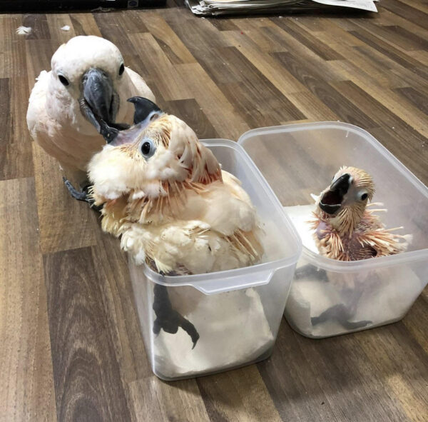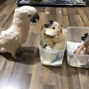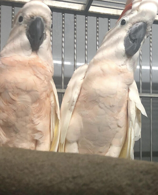Moluccan Cockatoos are entirely pink at first glance. However, if you startle or excite one, you will see the feathers of its crest pop up, forming a type of “headdress.” Under this “headdress,” the feathers are bright orange and salmon colored. The underside of their wings and tail is yellow, and when all of their feathers go up at once (which is common for this species) you will get quite a fantastic display of color! They have a bare patch of skin around their eyes which is blue in color. This patch of skin can sometimes help determine a Moluccan’s age since, like humans, this area tends to wrinkle as the birds get older.Average Lifespan: 40 – 80 years