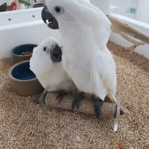 Hand-fed umbrella cockatoos can be friendly, well-behaved pets. Many learn to do tricks and can mimic speech quite well. But as highly social birds, they tend to be very affectionate and even borderline obsessive about spending time with their favorite people. Still, many are beloved family pets gentle enough for older children.