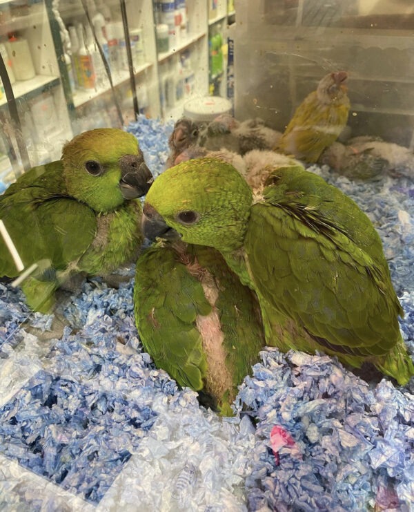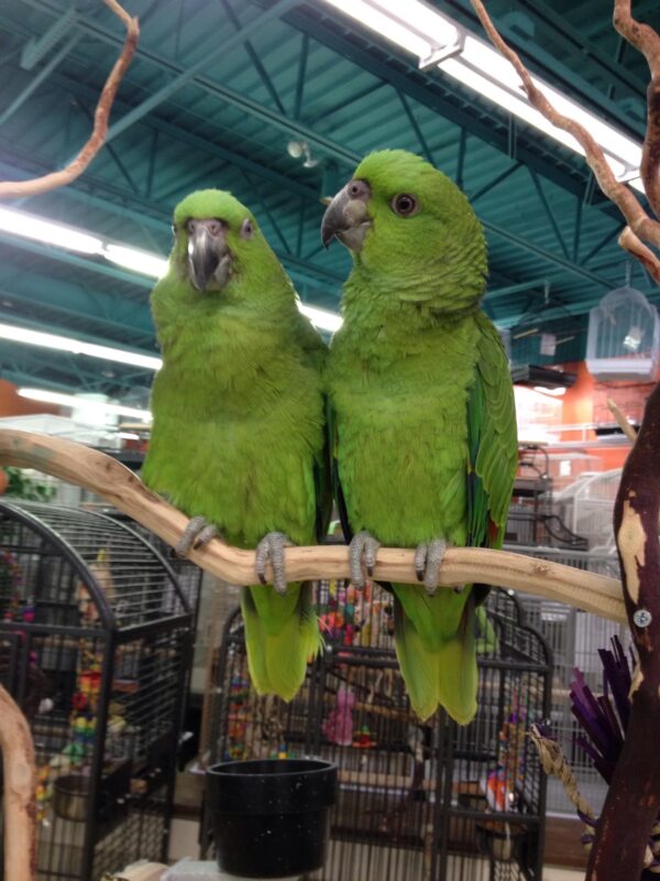 The Yellow-Nape Amazon is 12-15 inches in height from heat to tail. The can weigh between 480-680 grams. Their distinguishing features are the yellow band of feathers that can be found on the nape or back of the neck. A young nape may have little or no yellow as this coloration develops with age. The body of the yellow-nape is beautiful green. They have a dark grey beak with the upper beak being somewhat lighter and they have grey feet. Average Lifespan: 35-60 years